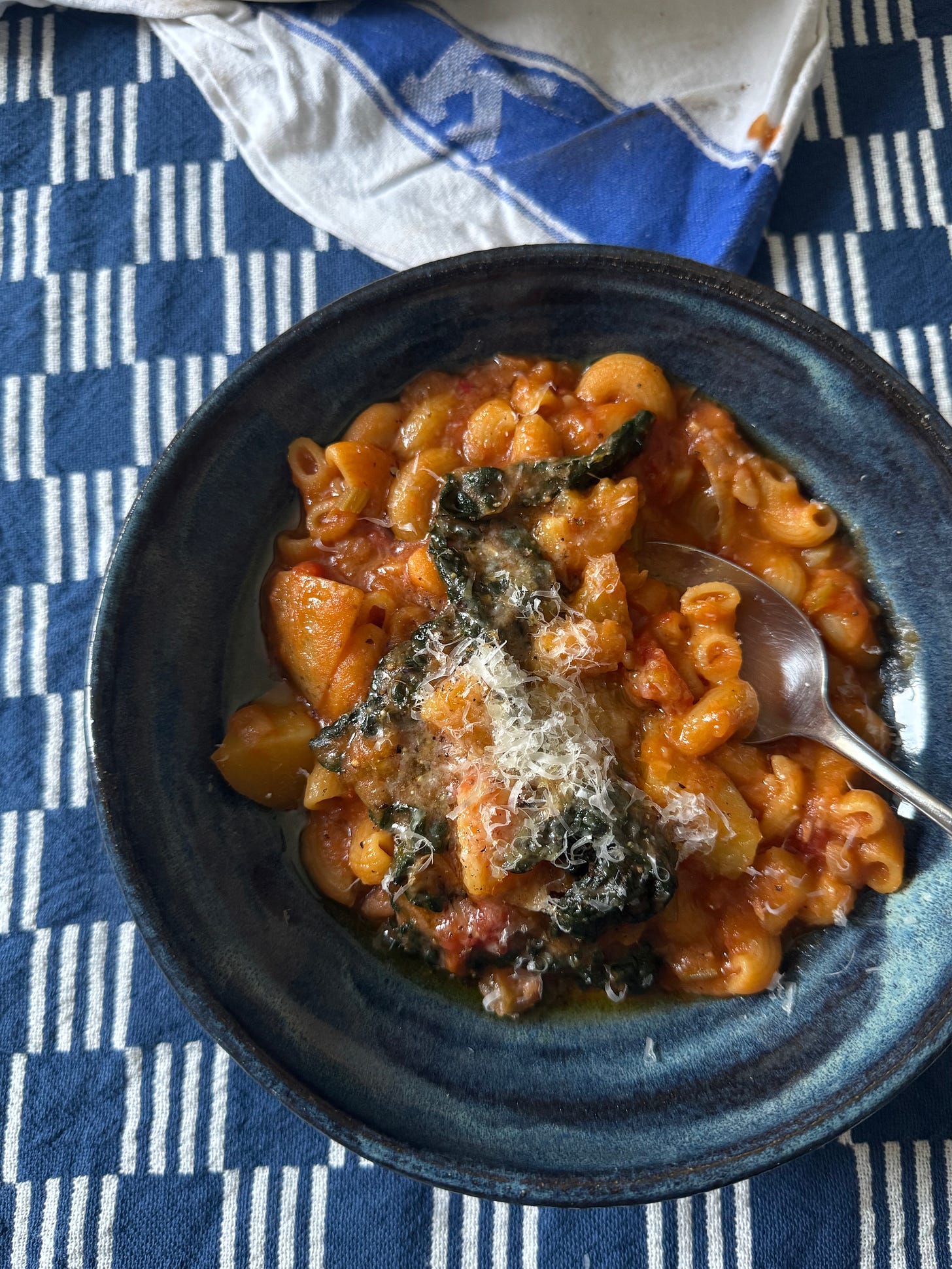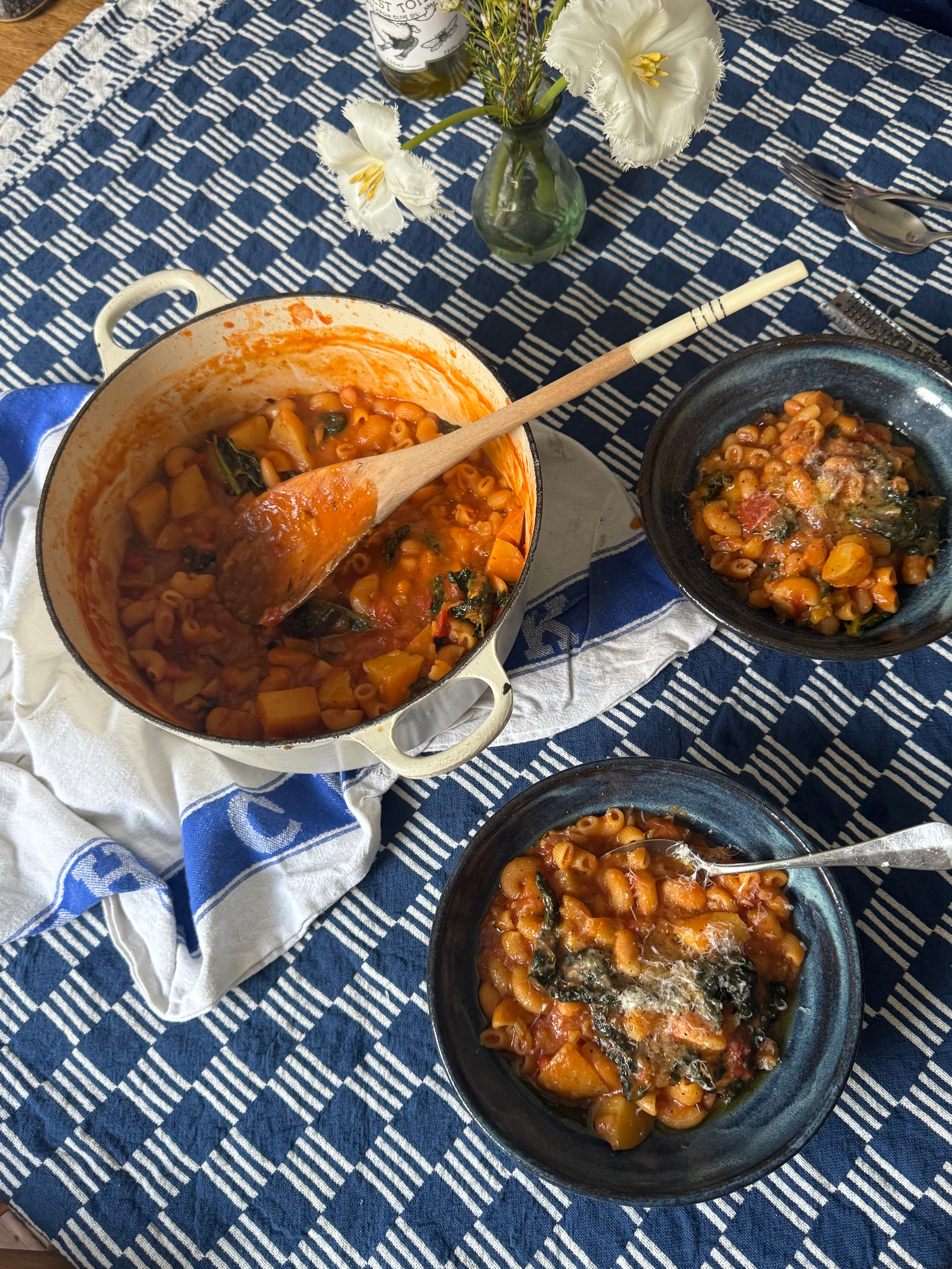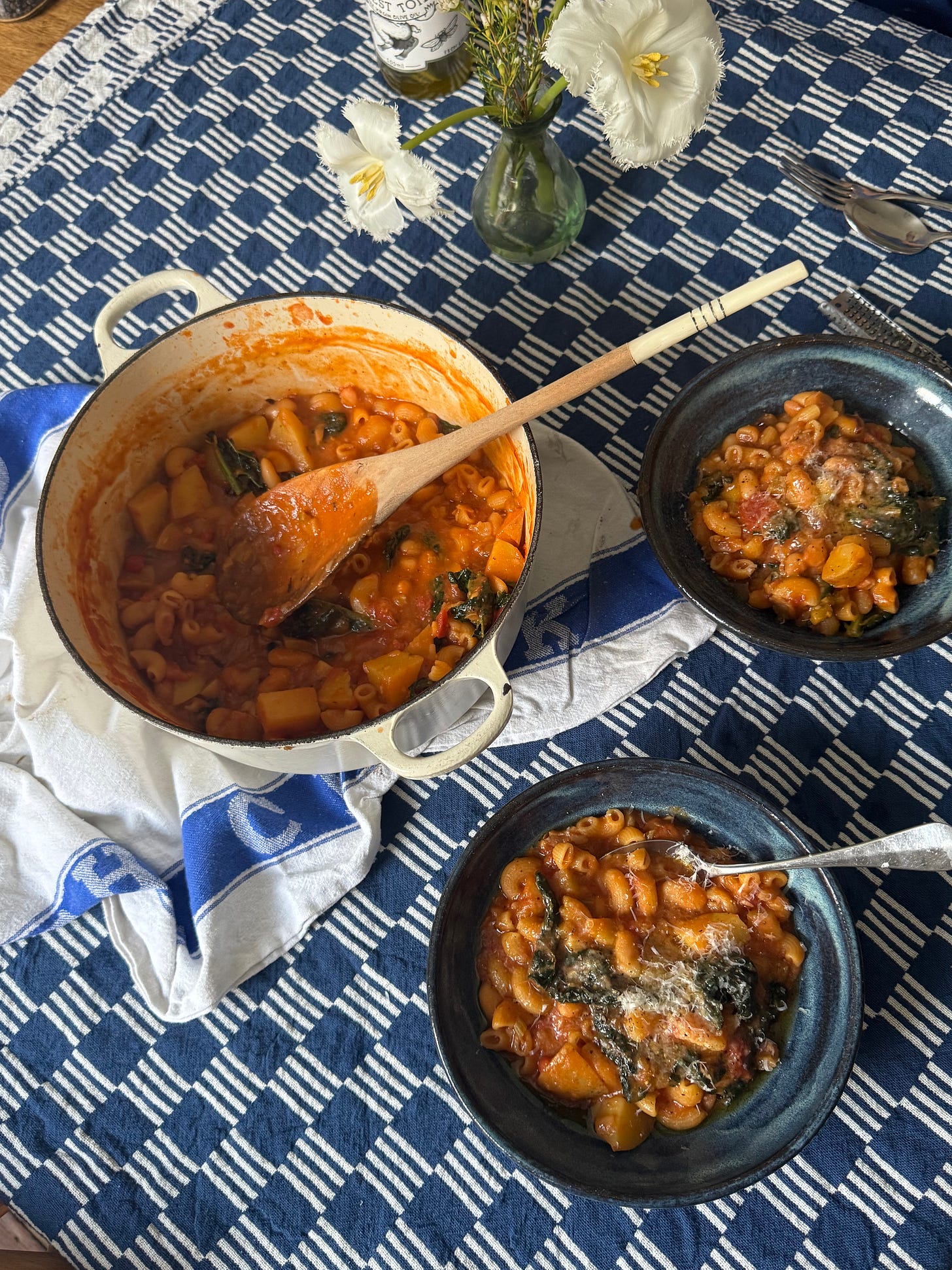 I’d fully intended for the following recipe to be classified as a soup. I had a few stalks of cavolo nero languishing in my fridge and a hankering for a warming, vegetable-forward broth. A cavolo nero minestrone seemed like the obvious answer to my craving. However, the more I rummaged through my fridge, the more lonely-looking ingredients I turned up—each loose potato, carrot, and celery stick beckoning to my stew. And so, it grew starchier and starchier until I found a handful of pasta making its way into the pot. Minestrone went out the window, and a pasta e fagioli was born.